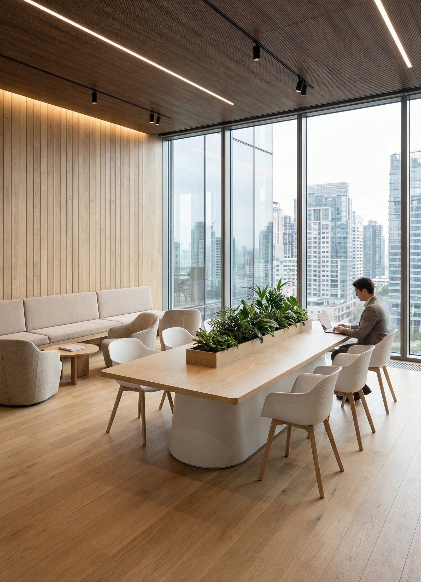 【GROVE林聚】以⾃然与光构建空间氛围,在室内形成可停留的交流岛屿。通过将绿植与灯光融⼊结构,它在空间中形成多个可停留、可交流的节点。